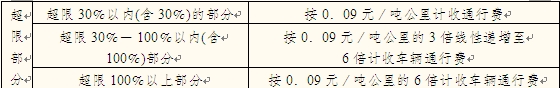 2. 超限30%—100%以內(含100%)部分,按0.09元/噸公里3倍線性遞增到6倍計收通行費。