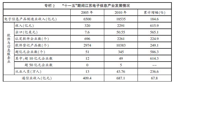 全省擁有1個國家級電子信息產業基地、4個國家級電子信息產業園、12個省級電子信息產業基地、15個省級電子信息產業園,形成了沿滬寧線信息產業密集帶,其業務收入占全省的比重超過80%,國際化水平不斷提高。全省已形成軟件業務收入超億元的企業345家、超10億元企業49家、超50億元企業5家,有21家企業成為全國規劃布局內重點軟件企業,12家企業上市。信息產業重大科技專項實施取得階段性成果,截至2010年底,信息技術領域累計發明專利申請量23611件,占全省發明專利申請量的28.8%,申請總量和增幅均居全國前列。