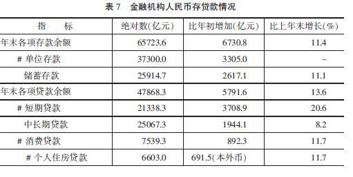 金融市場貨幣供應量平穩回落。年末全省金融機構人民幣存款余額比年初增加6730.8億元,比上年少增3345.6億元。其中,儲蓄存款增加2617.1億元,少增601.9億元;單位存款增加3305億元,少增3283.9億元。年末金融機構人民幣貸款余額比年初增加5791.6億元,比上年少增1031.8億元。其中,短期貸款增加3708.9億元,多增710.7億元。