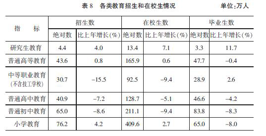教育事業全面協調發展。全省共有普通高校126所,普通高等教育招生43.6萬人,在校生165.9萬人,畢業生47.7萬人;研究生教育招生4.4萬人,在校研究生13.4萬人,畢業生3.3萬人。高等教育毛入學率達45%。全省中等職業教育在校生達92.5萬人(不含技工學校)。小學在校生年鞏固率達99.85%,初中在校生年鞏固率達98.6%,高中階段教育毛入學率達97%,基本普及高中階段教育。初中畢業生升學率97.7%。小學學齡兒童入學率99.94%。特殊教育招生0.4萬人,在校生2.3萬人。幼兒園在園幼兒217.5萬人。