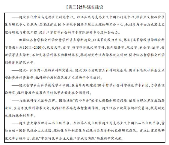 3.加快建設(shè)社科強(qiáng)省。更好發(fā)揮哲學(xué)社會(huì)科學(xué)認(rèn)識(shí)世界、傳承文明、創(chuàng)新理論、咨政育人、服務(wù)社會(huì)的重要功能,堅(jiān)持基礎(chǔ)研究和應(yīng)用研究并重,傳統(tǒng)學(xué)科和新興學(xué)科、交叉學(xué)科并重,努力形成哲學(xué)社會(huì)科學(xué)創(chuàng)新體系,鞏固江蘇哲學(xué)社會(huì)科學(xué)在全國(guó)的領(lǐng)先地位。