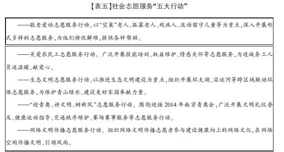 3.開展志愿行動(dòng)。倡導(dǎo)志愿理念,弘揚(yáng)志愿精神,增強(qiáng)公民的社會(huì)責(zé)任意識(shí)和奉獻(xiàn)精神,引導(dǎo)人們?cè)谧龊檬隆I(xiàn)愛心的過程中陶冶情操、提升境界,在全社會(huì)形成團(tuán)結(jié)互助、平等友愛、共同進(jìn)步的社會(huì)氛圍。認(rèn)真組織“學(xué)習(xí)雷鋒榜樣,踐行江蘇精神,匯聚道德力量”活動(dòng),把學(xué)習(xí)雷鋒與開展志愿服務(wù)結(jié)合起來,廣泛開展學(xué)習(xí)踐行雷鋒精神活動(dòng),推動(dòng)學(xué)雷鋒活動(dòng)常態(tài)化。統(tǒng)籌社會(huì)志愿服務(wù)工作,重點(diǎn)開展社會(huì)志愿服務(wù)“五大行動(dòng)”,提高志愿服務(wù)的科學(xué)化、規(guī)范化和社會(huì)化水平,打造一批有全國(guó)影響的志愿服務(wù)品牌。到2015年,全省注冊(cè)志愿者數(shù)量占城市總?cè)丝?5%以上、占農(nóng)村人口10%以上,在全社會(huì)形成關(guān)心、支持和參與志愿服務(wù)的濃厚氛圍。