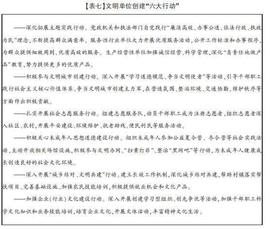5.深化文明創(chuàng)建活動(dòng)。深入推進(jìn)文明城市、文明村鎮(zhèn)、文明單位、文明社區(qū)、文明集市、文明風(fēng)景旅游區(qū)等創(chuàng)建活動(dòng),協(xié)調(diào)推進(jìn)城鄉(xiāng)文明建設(shè),開展“市民公共文明指數(shù)”、“鄉(xiāng)風(fēng)文明指數(shù)”和“行業(yè)文明服務(wù)公眾滿意度指數(shù)”測(cè)評(píng),不斷提高社會(huì)文明程度和群眾滿意度。繼續(xù)抓好“百城萬店無假貨”、“放心消費(fèi)”等創(chuàng)建活動(dòng),引導(dǎo)、推動(dòng)新經(jīng)濟(jì)組織和新社會(huì)組織開展創(chuàng)建活動(dòng)。到2015年,力爭(zhēng)創(chuàng)建全國(guó)文明城市10個(gè)、文明村鎮(zhèn)120個(gè)、文明單位180個(gè),打造區(qū)域文明城市群和文明城鎮(zhèn)群。