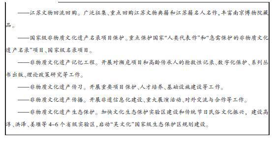 1.完善保護(hù)體系。編制全省國(guó)家重點(diǎn)文物保護(hù)單位保護(hù)規(guī)劃,建立面向應(yīng)用、重點(diǎn)突出、科學(xué)規(guī)范、便于操作的文物保護(hù)體系。構(gòu)建全省文物信息化發(fā)展框架,開展全省文物資源基礎(chǔ)數(shù)據(jù)庫(kù)、文物預(yù)防性保護(hù)信息平臺(tái)、文物博物館公共服務(wù)平臺(tái)和文物安全監(jiān)測(cè)平臺(tái)建設(shè)。強(qiáng)化文物安全防范措施,提高文物安全防范能力。以非物質(zhì)文化遺產(chǎn)名錄項(xiàng)目和傳承人保護(hù)為核心,建立科學(xué)有效的非物質(zhì)文化遺產(chǎn)四級(jí)保護(hù)體系。全省所有縣(市)全部建立非遺名錄以及相對(duì)應(yīng)的傳承人認(rèn)定、命名和資助制度,對(duì)瀕危項(xiàng)目和年老體弱的代表性傳承人實(shí)施搶救性保護(hù)。成立江蘇省文物保護(hù)研究中心,建立蘇南、蘇北考古工作站。