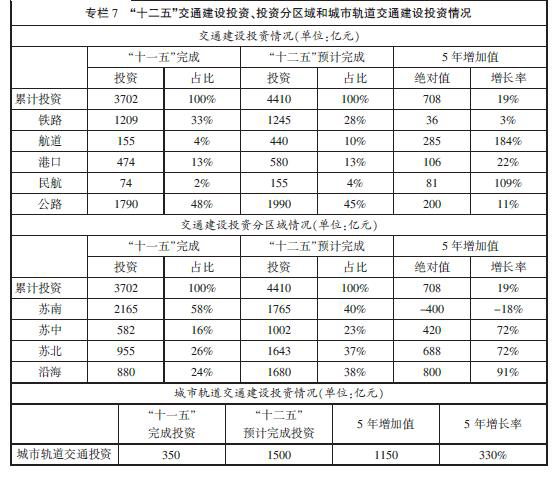 “十一五”期間,我省認真貫徹落實“擴內需促增長”的政策措施,緊緊抓住實施長江三角洲一體化和江蘇沿海開發戰略的重大機遇,重點加大對鐵路、水運和民航的投資力度,加快推進一批對經濟社會發展具有重大影響和長遠意義的交通骨干工程,有力地保障了經濟平穩較快發展。全省交通基礎設施建設完成投資3702億元(原有統計口徑,不含城市軌道和管道),是“十五”時期的2.2倍。其中:鐵路、水運、民航和公路分別完成投資1209億元、629億元、74億元和1790億元,是“十五”時期的17.3倍、6.4倍、18.5倍和1.2倍。城市軌道交通完成投資350億元,是“十五”時期的4.1倍。建成了滬寧城際高速鐵路、蘇通大橋、南京三橋、沿海高速公路、連云港港30萬噸級礦石碼頭、太倉港集裝箱三期工程、長江口12.5米深水航道整治及延伸至太倉工程、淮安漣水機場等,開工建設了京滬高速鐵路、寧杭城際鐵路、泰州大橋、南京四橋、崇啟大橋、臨海高等級公路、連云港港30萬噸級深水航道、南京祿口國際機場二期工程、蘇南運河三級航道整治工程等項目。