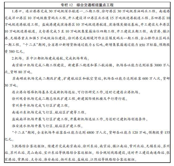 突出重點,提高服務能力和水平,加快建設蘇州、無錫、常州、鎮江、揚州、泰州、南通、鹽城、淮安、宿遷、海安、昆山等一批省級綜合交通樞紐,進一步增強區域經濟競爭力。