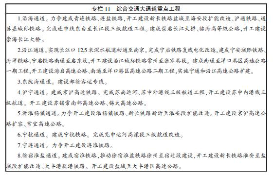 構建沿海通道。充分發揮沿海土地、岸線和區位優勢,加快完善交通基礎設施建設,積極推進沿海地區產業帶成長、城鎮帶發育,促進蘇中、蘇北跨越發展。重點打造沿海港口、水路和鐵路運輸,完善公路運輸,建成適應沿海地區北煤南運、北糧南運以及原油等重要物資運輸,連接環渤海地區與長江三角洲的運輸大通道。利用港口資源豐富的優勢,加快推進以連云港港為核心、鹽城港和南通港為支撐的沿海港口群建設,加強與我國近、遠洋運輸網絡的連接,壯大港口實力,增強輻射帶動能力。加快大能力沿海鐵路通道建設。以完善連云港港疏港系統為重點,加快提升連申線、鹽河等航道等級,加快建成臨海高等級公路,加強與重點港區相連的鐵路支線建設。“十二五”期間,通道內新增鐵路里程284公里,新增三級以上航道達標里程139公里,新改建臨海一級公路488公里,新增高速公路31公里,預期投資450億元。到2015年,通道江北段客運能力達到1.6億人/年、貨運能力達到2億噸/年,比“十一五”時期末分別提升47%和50%;通道江南段客運能力達到2.3億人/年、貨運能力達到2.3億噸/年,比“十一五”時期末分別提升21%和36%。