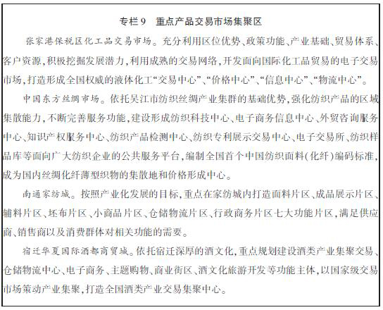 產(chǎn)品交易市場集聚區(qū)。以工業(yè)產(chǎn)品、日用消費品的交易為主,在全省范圍內(nèi)重點建設(shè)集電子商務(wù)、產(chǎn)品展示、產(chǎn)品交易、批發(fā)零售、研發(fā)設(shè)計、旅游會展、價格發(fā)布、儲運物流等為一體的集中區(qū)域。在制造業(yè)較為發(fā)達、工業(yè)原材料和產(chǎn)品用量較大、擁有便捷交通方式的區(qū)域,江陰、張家港、常熟一帶建設(shè)工業(yè)用品專業(yè)交易市場。在擁有公路、鐵路、水路多式聯(lián)運,城郊結(jié)合部的交通樞紐區(qū)域建設(shè)農(nóng)產(chǎn)品以及其他日用品為主的綜合性交易市場。側(cè)重有形市場和無形市場結(jié)合,強化信息化建設(shè)。
