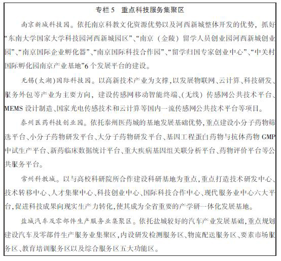 科技服務(wù)集聚區(qū)。充分發(fā)揮我省科技、人才和創(chuàng)新等方面的優(yōu)勢,大力發(fā)展產(chǎn)業(yè)特色鮮明的科技服務(wù)集聚區(qū),提高科技成果轉(zhuǎn)化能力,把各類園區(qū)建設(shè)成為高新技術(shù)研發(fā)聚集地、孵化基地和產(chǎn)業(yè)化基地。蘇南地區(qū)策應(yīng)產(chǎn)業(yè)高新化發(fā)展特征,重點發(fā)展科技創(chuàng)新服務(wù)集聚區(qū),以公共研發(fā)平臺建設(shè)為主,強化新興產(chǎn)業(yè)中關(guān)鍵技術(shù)和成果的研發(fā)與產(chǎn)業(yè)化。蘇中、蘇北地區(qū)則以科技創(chuàng)業(yè)集聚區(qū)建設(shè)為主,側(cè)重于為各類中小企業(yè)提供各類專業(yè)技術(shù)服務(wù)的集技術(shù)檢測、技術(shù)推廣服務(wù)、成果轉(zhuǎn)化產(chǎn)學(xué)研合作以及標準廠房、留學(xué)創(chuàng)業(yè)等基礎(chǔ)科技服務(wù)為主。