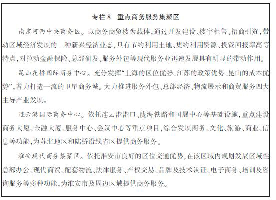 商務(wù)服務(wù)集聚區(qū)。以金融、商貿(mào)、商務(wù)活動為主體,集中布局總部、地區(qū)總部,發(fā)展高級商務(wù)酒店、高級生活服務(wù)相配套的商務(wù)服務(wù)業(yè)聚集區(qū)。以南京為中心,建設(shè)輻射南京都市圈的區(qū)域性商務(wù)集聚區(qū),強化南京河西CBD建設(shè)。以昆山、蘇州為中心,建設(shè)輻射無錫、南通以及上??h(區(qū))的特色商務(wù)服務(wù)集聚區(qū),為制造業(yè)的快速發(fā)展提供專業(yè)化服務(wù)。以徐州為中心,建設(shè)輻射徐州都市圈的商務(wù)服務(wù)集聚區(qū),為徐州老工業(yè)基地改造提升提供重要金融商務(wù)支撐。在連云港、鹽城、南通等地建設(shè)沿海地區(qū)商務(wù)集聚區(qū),為沿海開發(fā)提供服務(wù)。