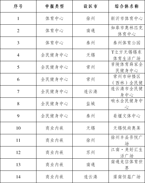 附1:江蘇省第七批體育服務綜合體名單(共14家)