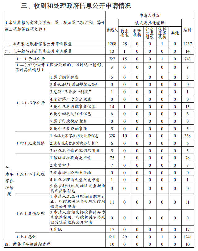 (二)提高依申請公開辦理質量。嚴格規范依申請公開辦理程序,持續抓好省政府辦公廳關于辦理程序和答復規范有關要求落實。全年辦理省政府及省政府辦公廳政府信息公開申請1241件,其中自然人申請件1211件,占比97.6%,法人或其他組織申請件30件;予以公開及部分公開746件,占比60.1%;處理與省政府有關的信息公開復議24件、行政訴訟案件12件。完善協調聯動機制,加強與職能部門的協商對接和信息共享,做好依申請公開工作指導提示,依法保障人民群眾信息需求。