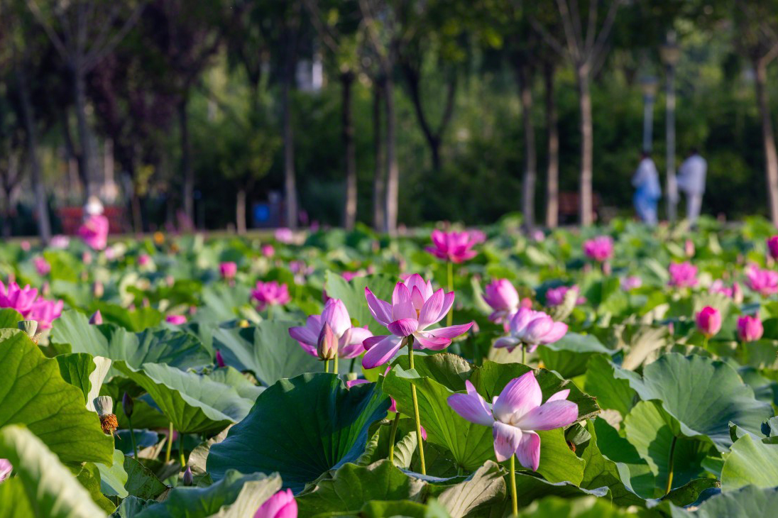 6月26日,泗洪縣大樓街道尾水濕地公園內(nèi),荷花盛開,清香四溢,吸引很多的市民前來晨練和游玩。李佳 攝